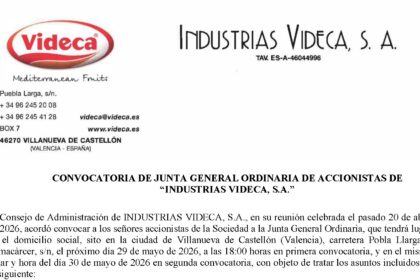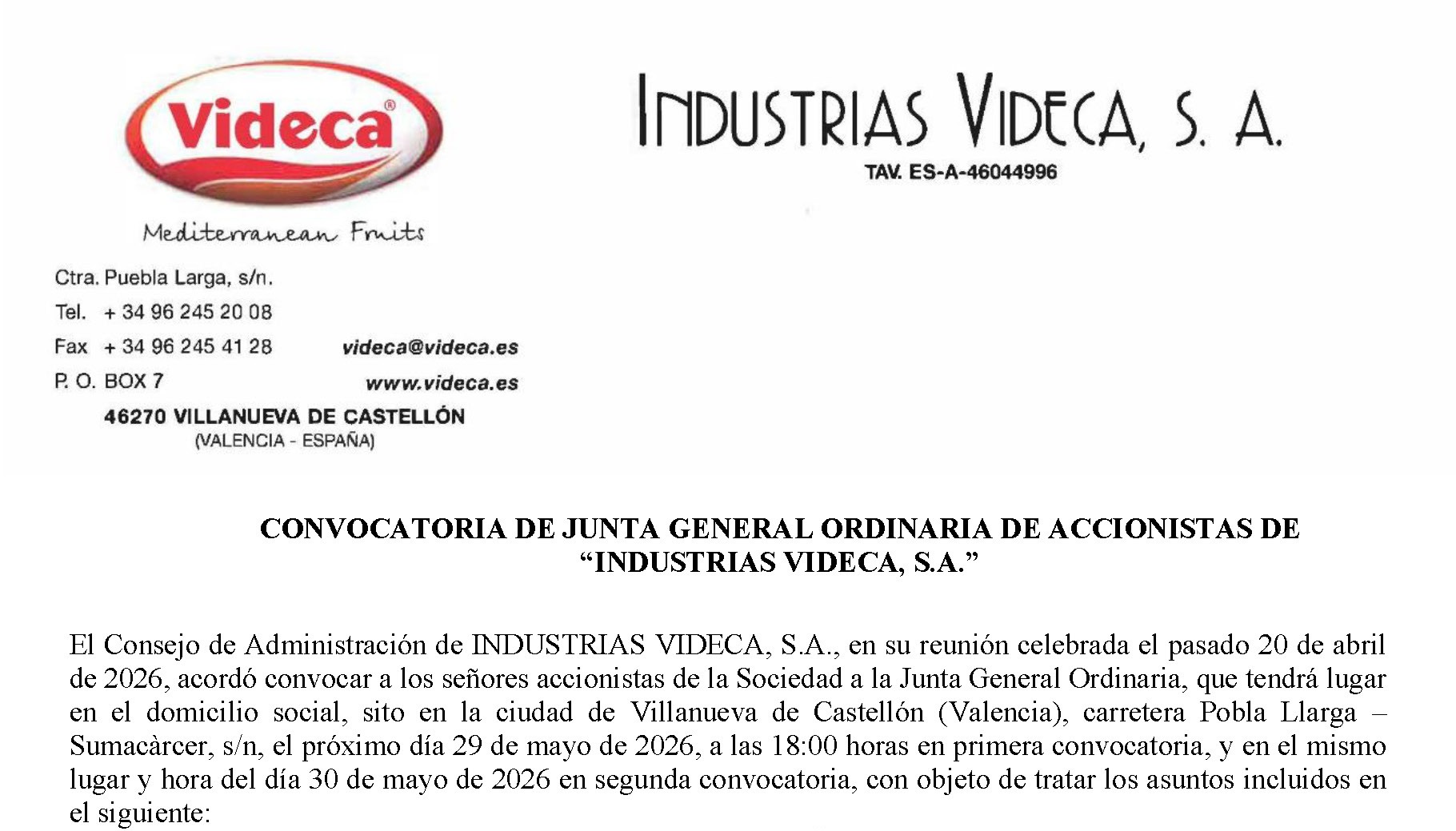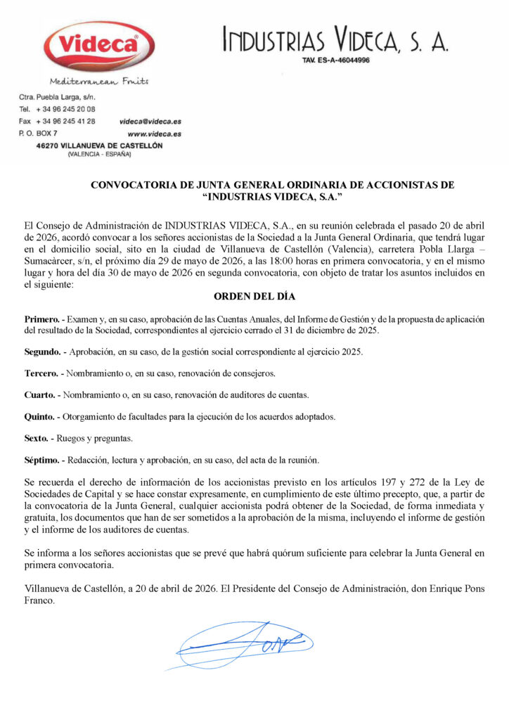 GENERAL MEETING OF SHAREHOLDERS OF INDUSTRIAS VIDECA